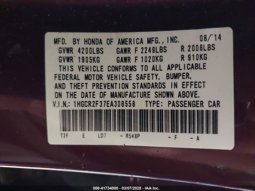 Color BurgundyCylinders 4Drive Front wheel driveVIN 1HGCR2F37EA******State Run & Drive VerifiedDamage Front leftAuction date 2025-03-26 AutoRIA