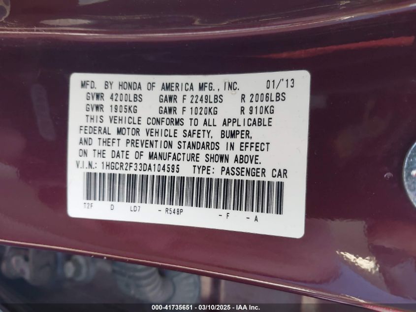 Color BurgundyCylinders 4Drive Front wheel driveVIN 1HGCR2F33DA******State Run & Drive VerifiedDamage Front or back AutoRIA