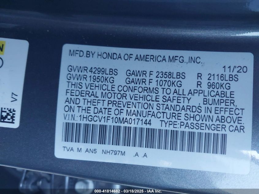 2021 HONDA ACCORD 2021 Gasoline, 1.5, Front wheel drive, VIN - 1HGCV1F10MA****** from the USA