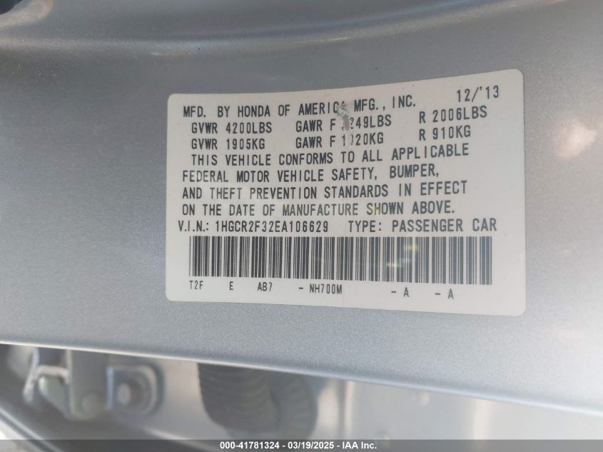 Color SilverCylinders 4Drive Front wheel driveVIN 1HGCR2F32EA******State Run & Drive VerifiedDamage Front left AutoRIA