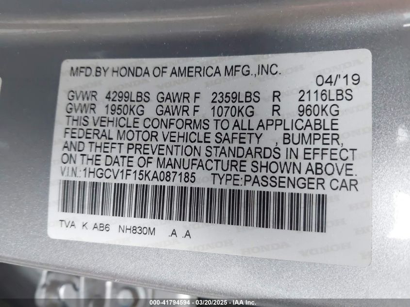 2019 HONDA ACCORD 2019 Gasoline, 1.5, Front wheel drive, VIN - 1HGCV1F15KA****** from the USA