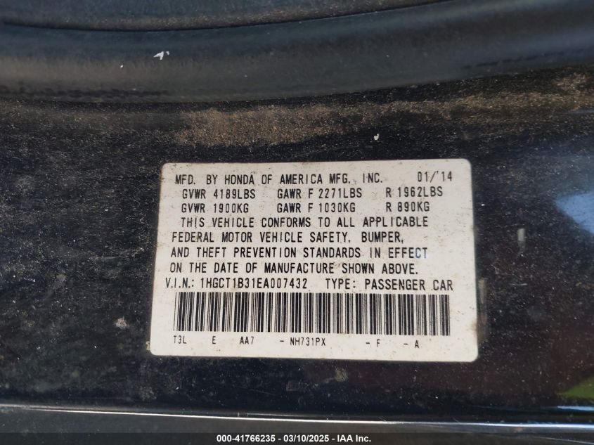Color BlackCylinders 4Drive Front wheel driveVIN 1HGCT1B31EA******State Run & Drive VerifiedDamage InsignificantAuction date 2025-03-26 AutoRIA