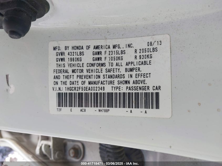 Color WhiteCylinders 4Drive Front wheel driveVIN 1HGCR2F50EA******State Run & Drive VerifiedDamage BackAuction date 2025-03-25 AutoRIA