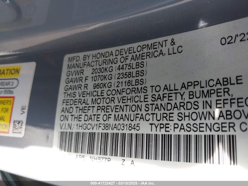 Color GrayCylinders 4Drive Front wheel driveVIN 1HGCV1F38NA******State Run & Drive VerifiedDamage Front right AutoRIA