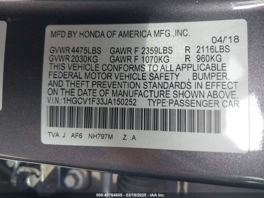 Color GrayCylinders 4Drive Front wheel driveVIN 1HGCV1F33JA******State Run & Drive VerifiedDamage Front or backAuction date 2025-03-27 AutoRIA