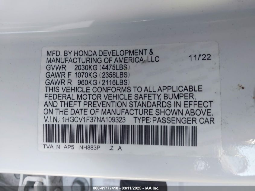 Color WhiteCylinders 4Drive Front wheel driveVIN 1HGCV1F37NA******State Run & Drive VerifiedDamage Front or back AutoRIA