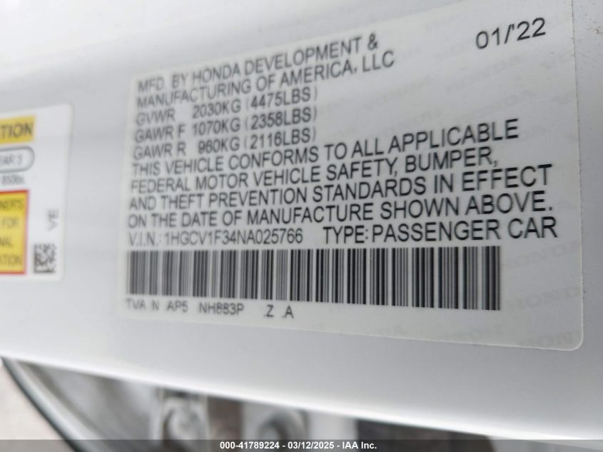 2022 HONDA ACCORD 2022 Gasoline, 1.5, Front wheel drive, VIN - 1HGCV1F34NA****** from the USA