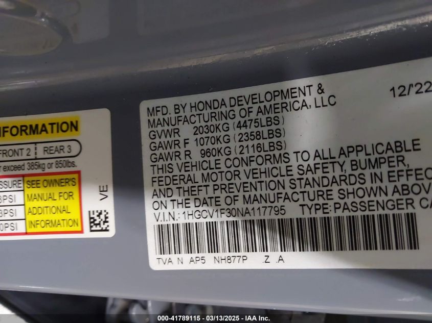 2022 HONDA ACCORD 2022 Gasoline, 1.5, Front wheel drive, VIN - 1HGCV1F30NA****** from the USA