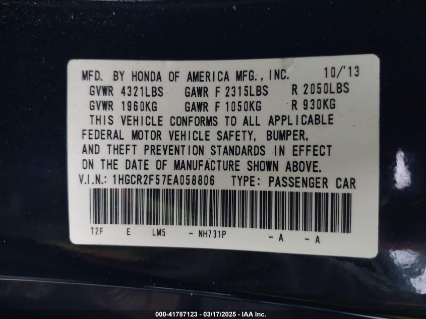 Color BlackCylinders 4Drive Front wheel driveVIN 1HGCR2F57EA******State Run & Drive VerifiedDamage Rear right AutoRIA