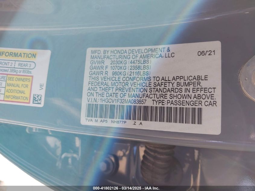 2021 HONDA ACCORD 2021 Gasoline, 1.5, Front wheel drive, VIN - 1HGCV1F32MA****** from the USA