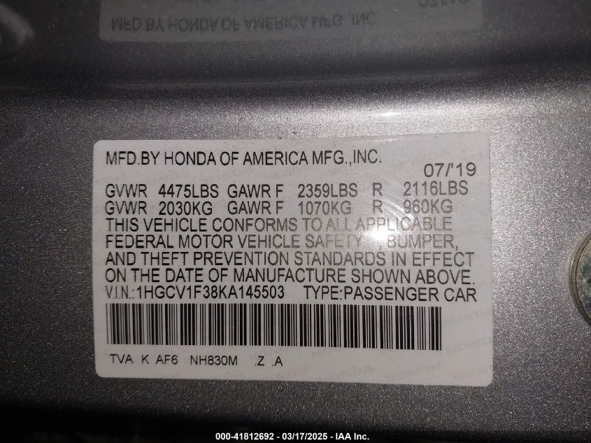 2019 HONDA ACCORD 2019 Gasoline, 1.5, Front wheel drive, VIN - 1HGCV1F38KA****** from the USA
