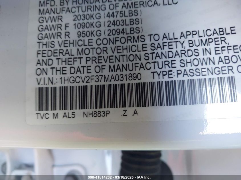 2021 HONDA ACCORD 2021 Gasoline, 2.0, Front wheel drive, VIN - 1HGCV2F37MA****** from the USA