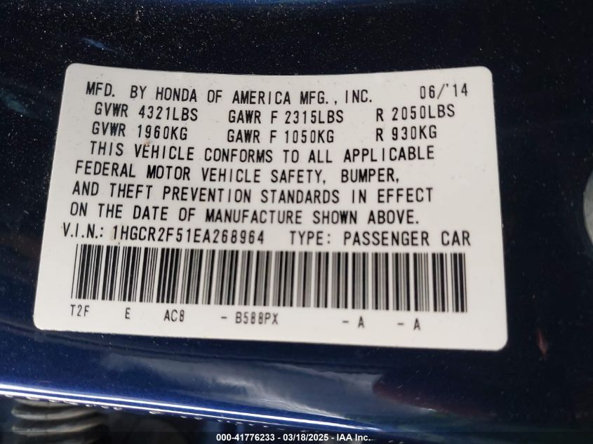 Color BlueCylinders 4Drive Front wheel driveVIN 1HGCR2F51EA******State Run & Drive VerifiedDamage Front right AutoRIA
