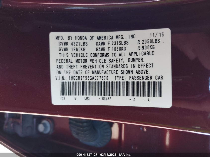 Color BurgundyCylinders 4Drive Front wheel driveVIN 1HGCR2F58GA******State Run & Drive VerifiedDamage Right side AutoRIA