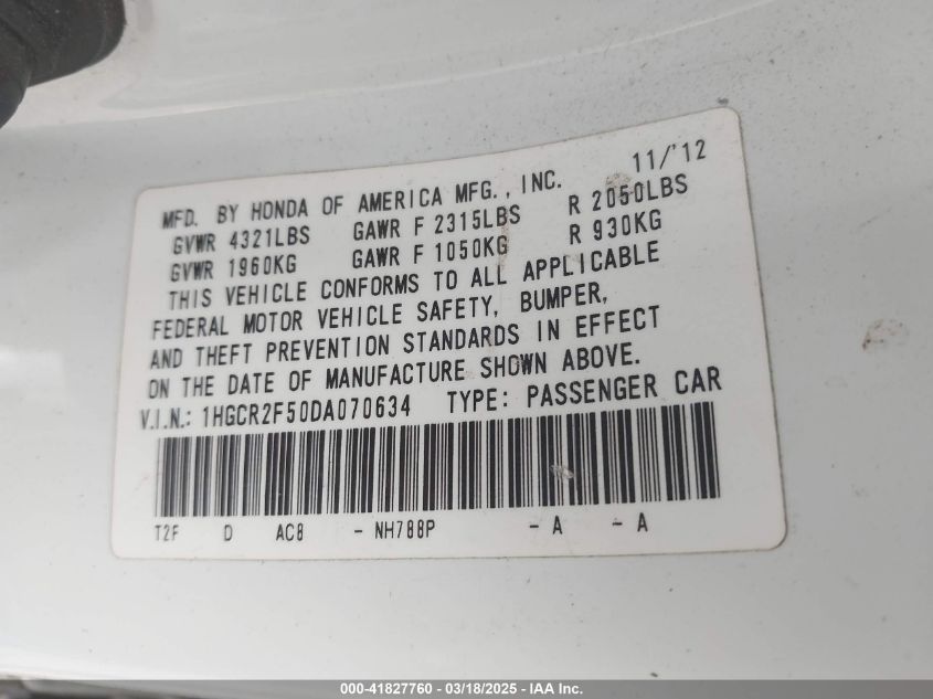 Color WhiteCylinders 4Drive Front wheel driveVIN 1HGCR2F50DA******State Run & Drive VerifiedDamage Front or back AutoRIA