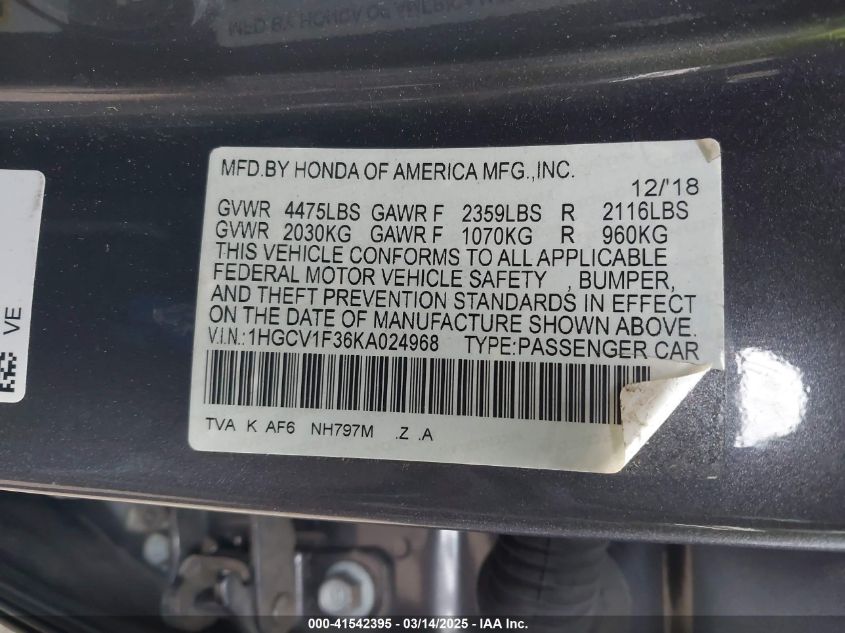 2019 HONDA ACCORD 2019 Gasoline, 1.5, Front wheel drive, VIN - 1HGCV1F34KA****** from the USA