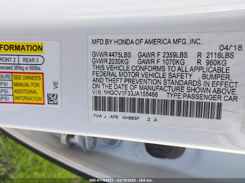 2018 HONDA ACCORD 2018 Gasoline, 1.5, Front wheel drive, VIN - 1HGCV1F33JA****** from the USA