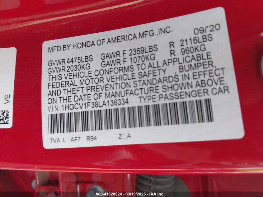 2020 HONDA ACCORD 2020 Gasoline, 1.5, Front wheel drive, VIN - 1HGCV1F38LA****** from the USA