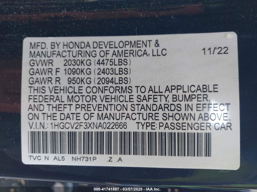 2022 HONDA ACCORD 2022 Gasoline, 2.0, Front wheel drive, VIN - 1HGCV2F3XNA****** from the USA
