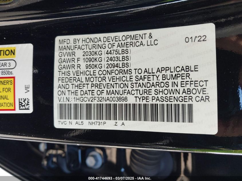 2022 HONDA ACCORD 2022 Gasoline, 2.0, Front wheel drive, VIN - 1HGCV2F32NA****** from the USA