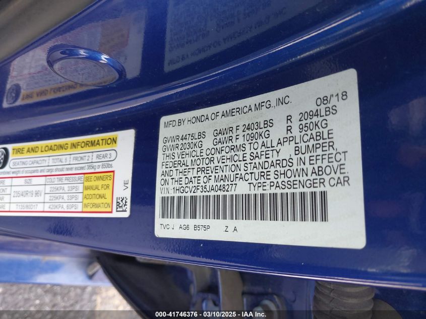 2018 HONDA ACCORD 2018 Gasoline, 2.0, Front wheel drive, VIN - 1HGCV2F35JA****** from the USA