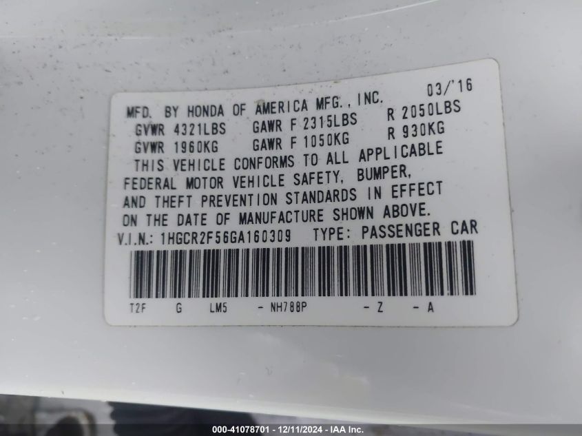 Color WhiteCylinders 4Drive Front wheel driveVIN 1HGCR2F56GA******State Run & Drive VerifiedDamage Front or back AutoRIA