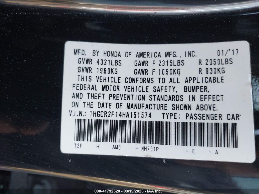 2017 HONDA ACCORD 2017 Gasoline, 2.4, Front wheel drive, VIN - 1HGCR2F14HA****** from the USA