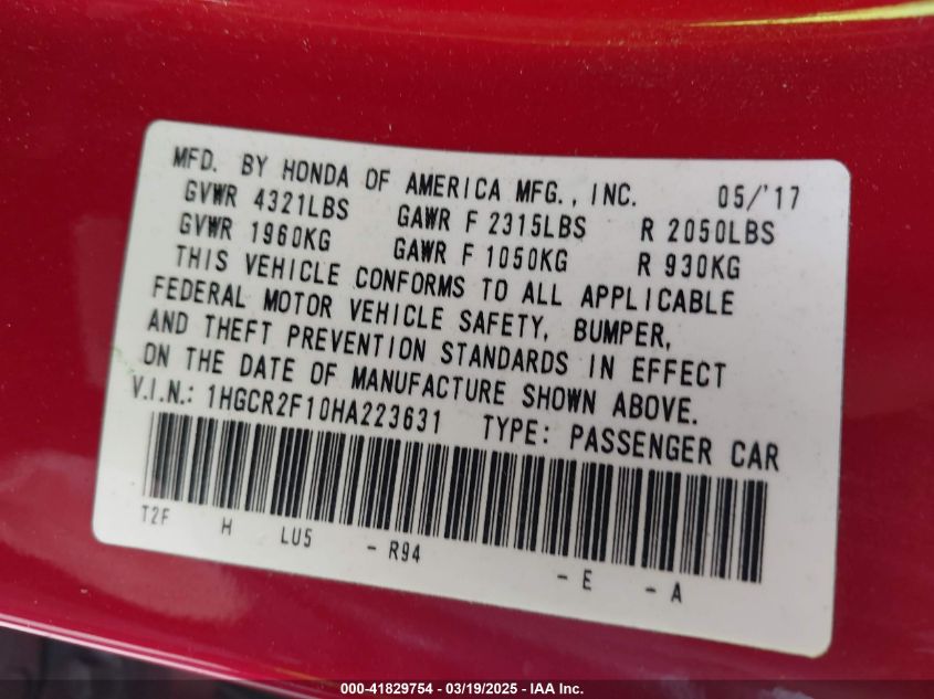 Color RedCylinders 4Drive Front wheel driveVIN 1HGCR2F10HA******State Run & Drive VerifiedDamage Front right AutoRIA