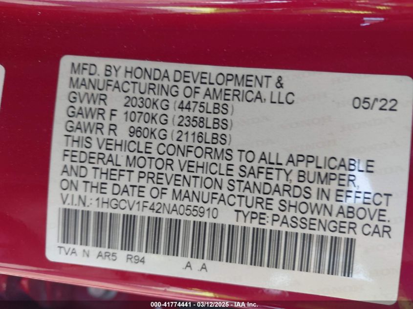 Color RedCylinders 4Drive Front wheel driveVIN 1HGCV1F42NA******State Run & Drive VerifiedDamage Right side AutoRIA