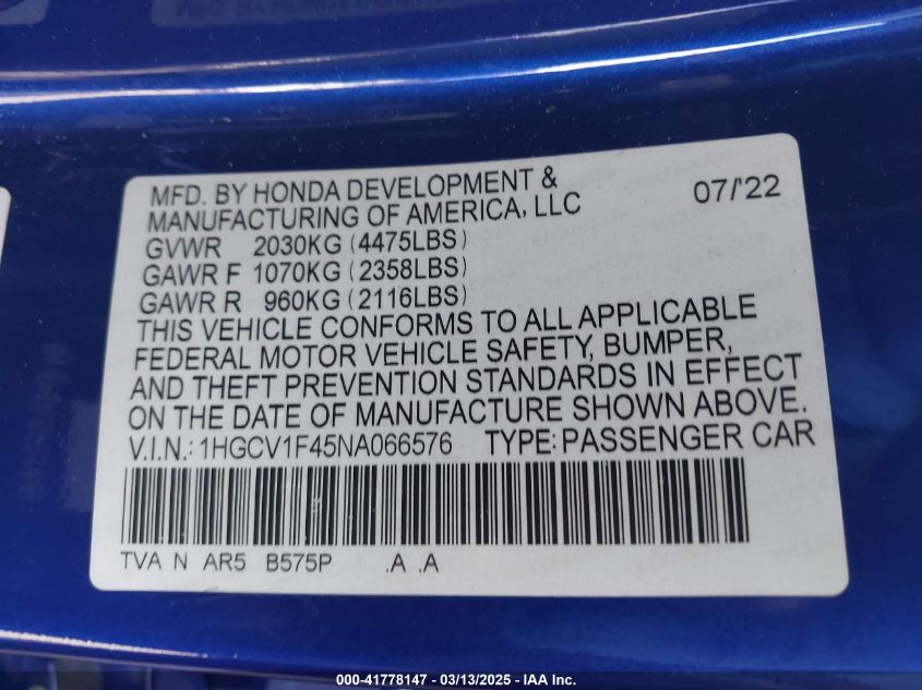 2022 HONDA ACCORD 2022 Gasoline, 1.5, Front wheel drive, VIN - 1HGCV1F45NA****** from the USA