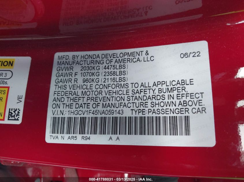 2022 HONDA ACCORD 2022 Gasoline, 1.5, Front wheel drive, VIN - 1HGCV1F45NA****** from the USA