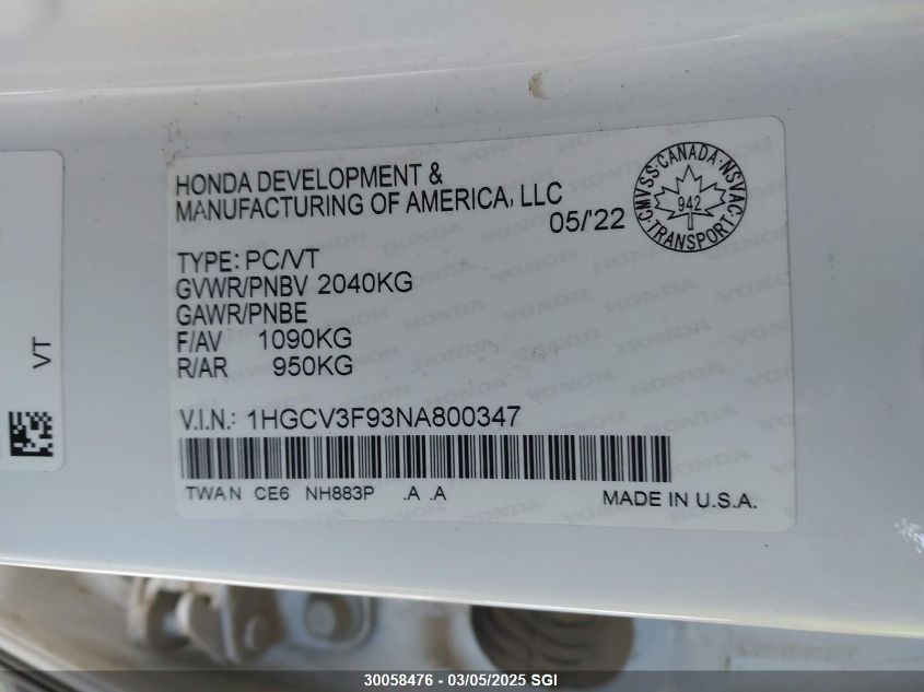 Color WhiteCylinders 4Drive UnknownVIN 1HGCV3F93NA******State Run & Drive VerifiedDamage FrontAuction date 2025-03-26 AutoRIA