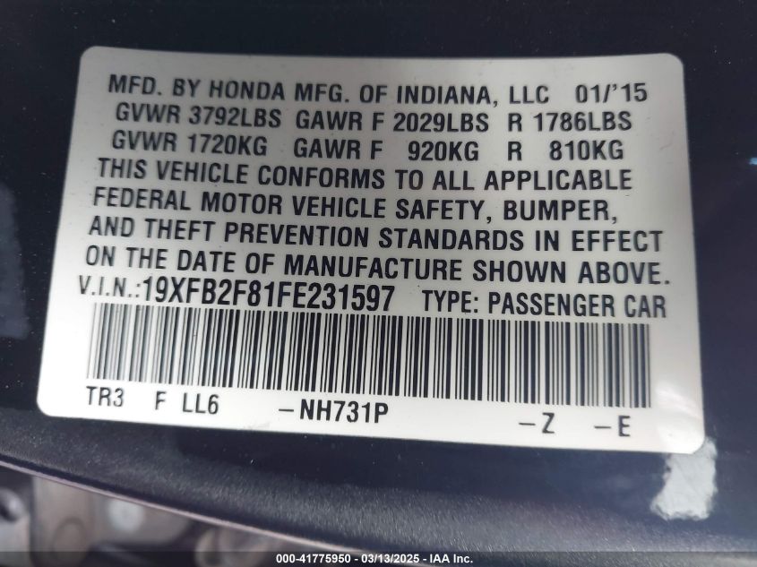Color BlackCylinders 4Drive Front wheel driveVIN 19XFB2F81FE******State Run & Drive VerifiedDamage From the sides AutoRIA