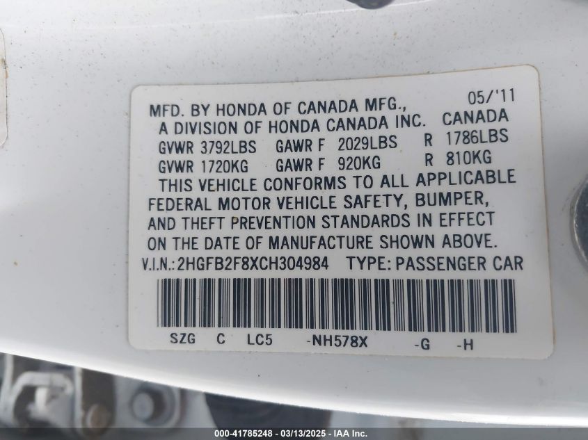 2012 HONDA CIVIC 2012 Gasoline, 1.8, Front wheel drive, VIN - 2HGFB2F8XCH****** from the USA