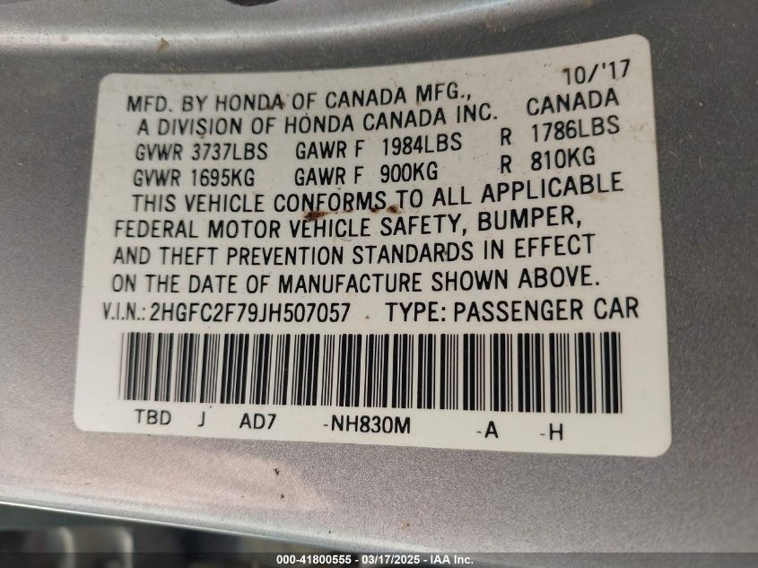 2018 HONDA CIVIC 2018 Gasoline, 2.0, Front wheel drive, VIN - 2HGFC2F79JH****** from the USA