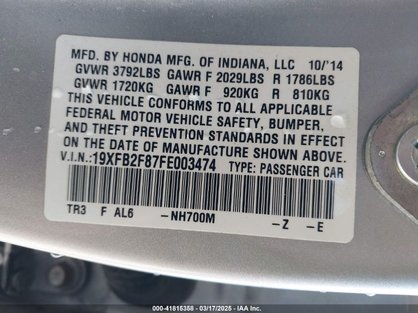 Color SilverCylinders 4Drive Front wheel driveVIN 19XFB2F87FE******State Run & Drive VerifiedDamage Front and back AutoRIA
