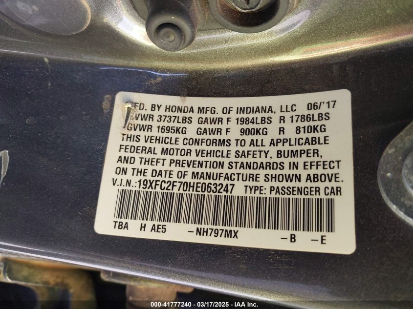 2017 HONDA CIVIC 2017 Gasoline, 2.0, Front wheel drive, VIN - 19XFC2F70HE****** from the USA