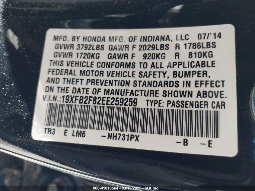 Color BlackCylinders 4Drive Front wheel driveVIN 19XFB2F82EE******State Run & Drive VerifiedDamage Right side AutoRIA