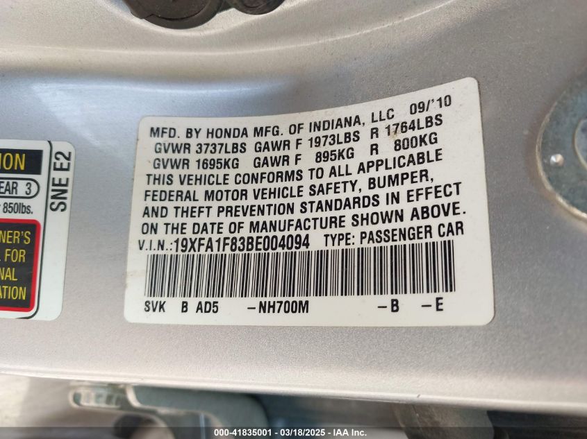 Color SilverCylinders 4Drive Front wheel driveVIN 19XFA1F83BE******State Run & Drive VerifiedDamage Front left AutoRIA
