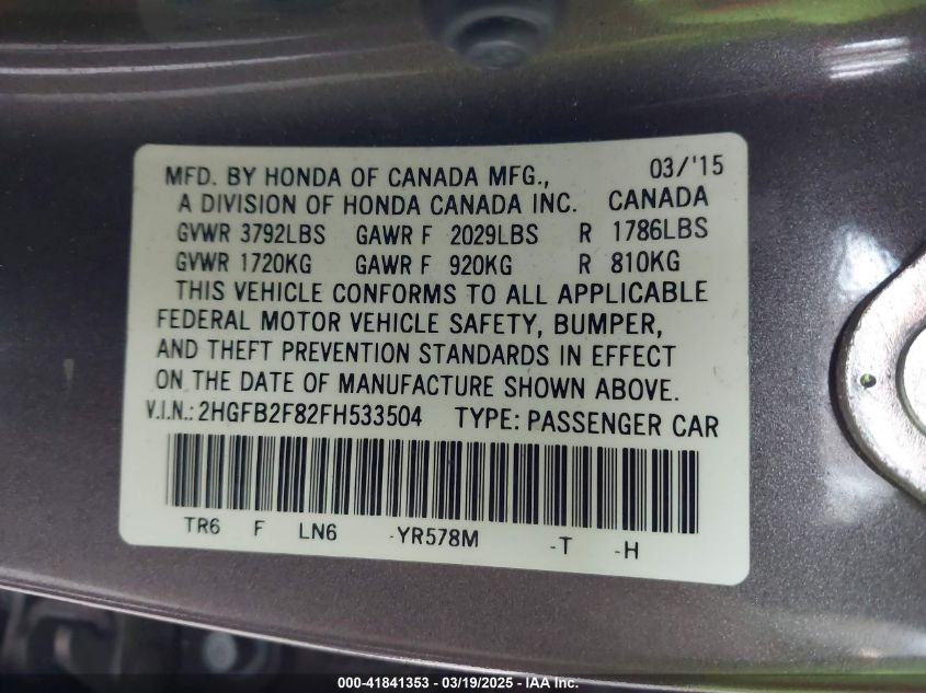 Color GrayCylinders 4Drive Front wheel driveVIN 2HGFB2F82FH******State Run & Drive VerifiedDamage Front or back AutoRIA