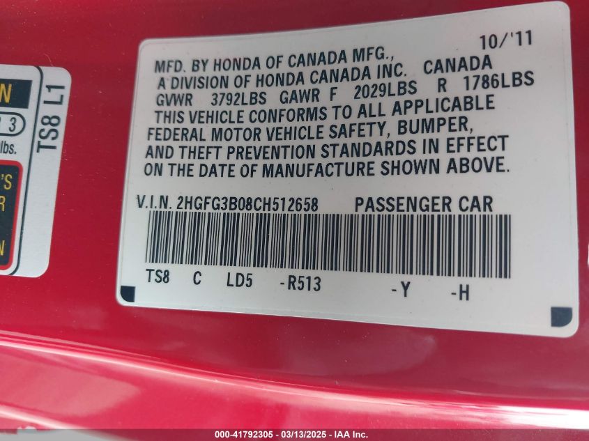 Color RedCylinders 4Drive Front wheel driveVIN 2HGFG3B08CH******State Run & Drive VerifiedDamage Front or back AutoRIA