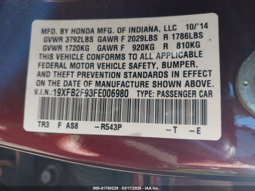 Color BurgundyCylinders 4Drive Front wheel driveVIN 19XFB2F93FE******State Run & Drive VerifiedDamage Front or back AutoRIA