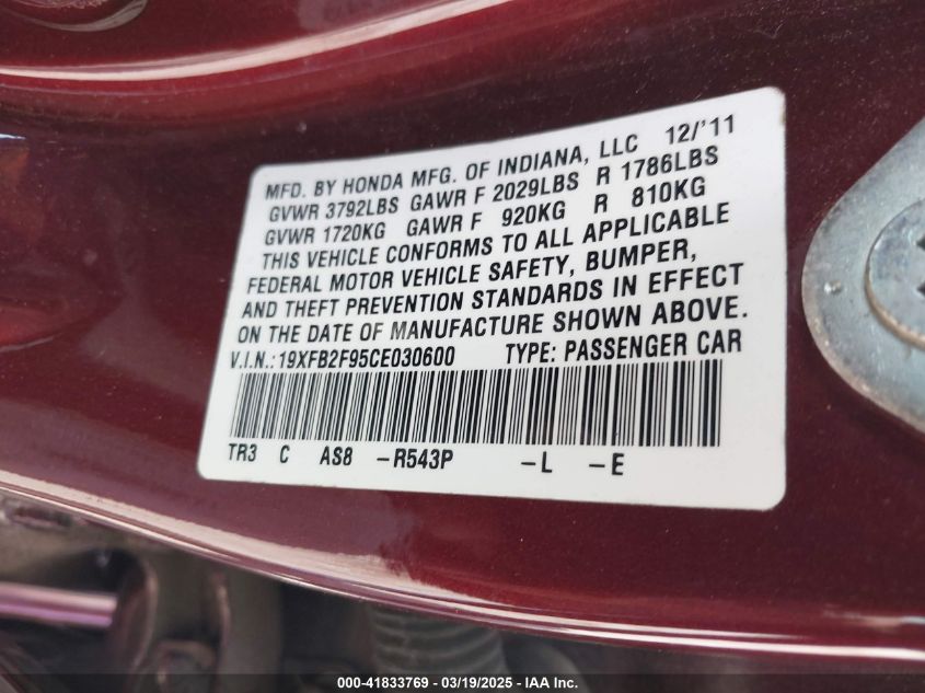 Color BurgundyCylinders 4Drive Front wheel driveVIN 19XFB2F95CE******State Run & Drive VerifiedDamage Front or back AutoRIA