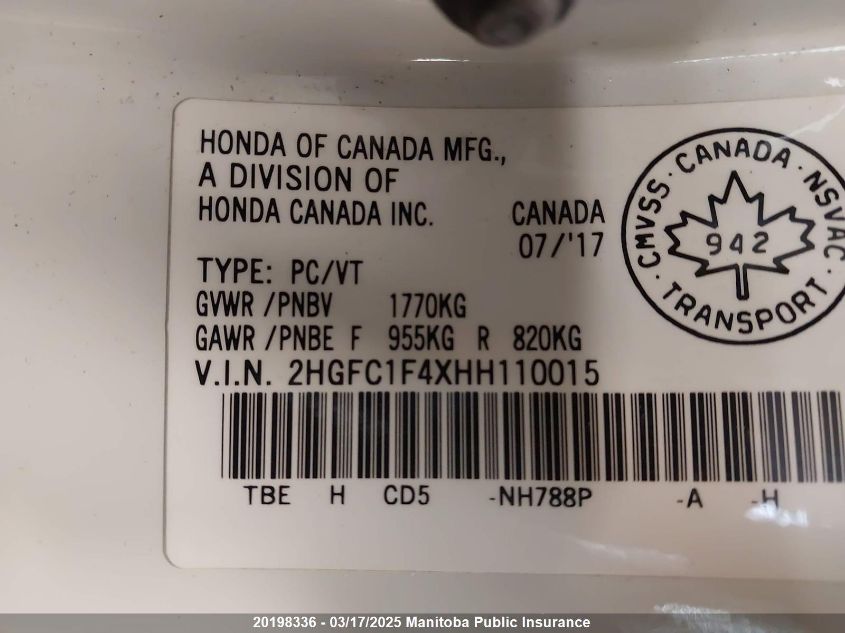 Color WhiteCylinders 4Drive UnknownVIN 2HGFC1F4XHH******State Run & Drive VerifiedDamage Front leftAuction date 2025-03-26 AutoRIA