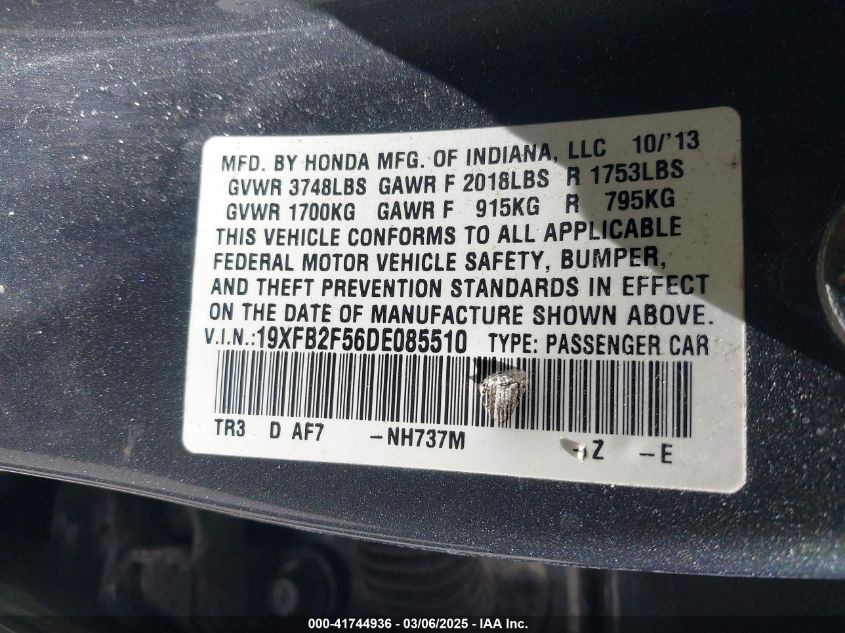 Color GrayCylinders 4Drive Front wheel driveVIN 19XFB2F56DE******State Run & Drive VerifiedDamage Front and backAuction date 2025-03-20 AutoRIA