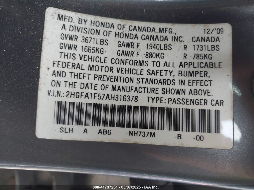 2010 HONDA CIVIC 2010 Gasoline, 1.8, Front wheel drive, VIN - 2HGFA1F57AH****** from the USA