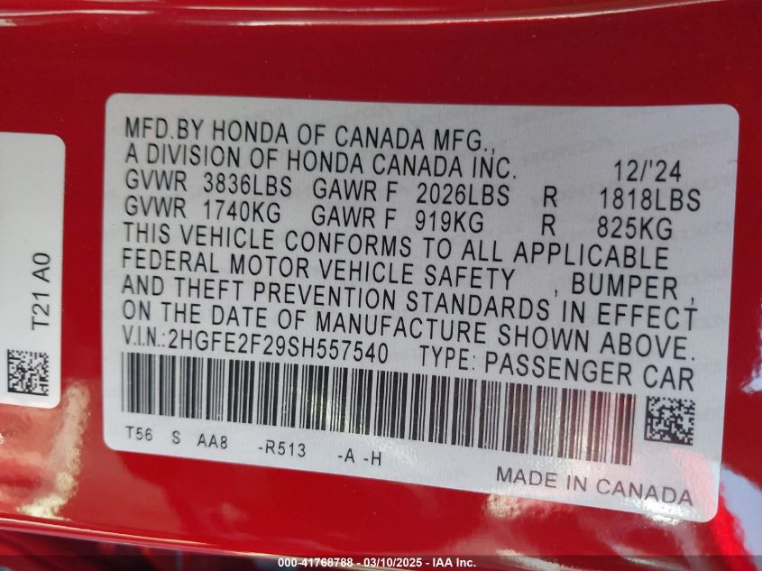 2025 HONDA CIVIC 2025 Gasoline, 2.0, Front wheel drive, VIN - 2HGFE2F29SH****** from the USA