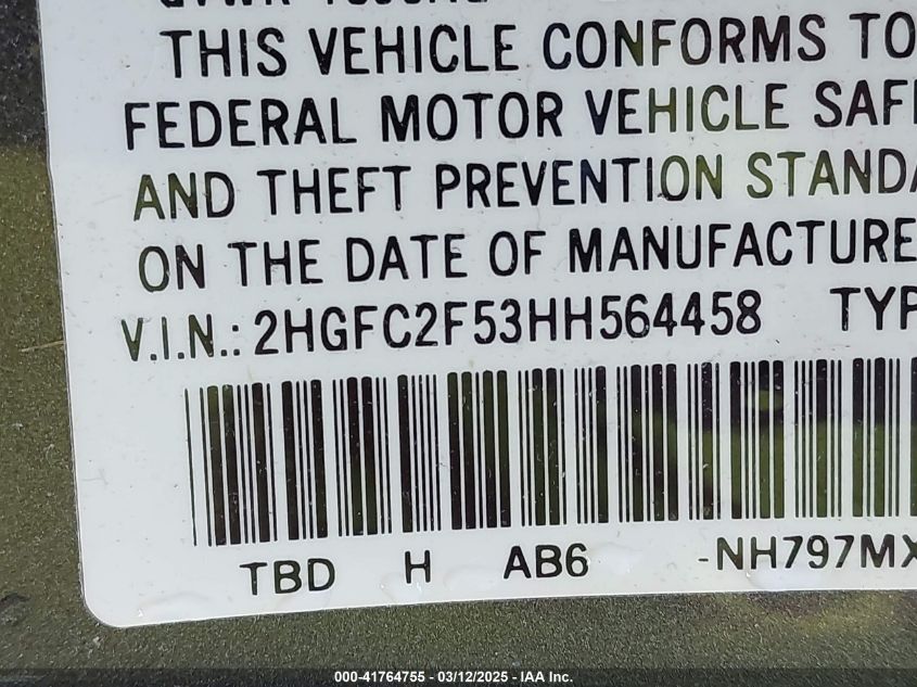 Color GrayCylinders 4Drive Front wheel driveVIN 2HGFC2F53HH******State Run & Drive VerifiedDamage Front right AutoRIA