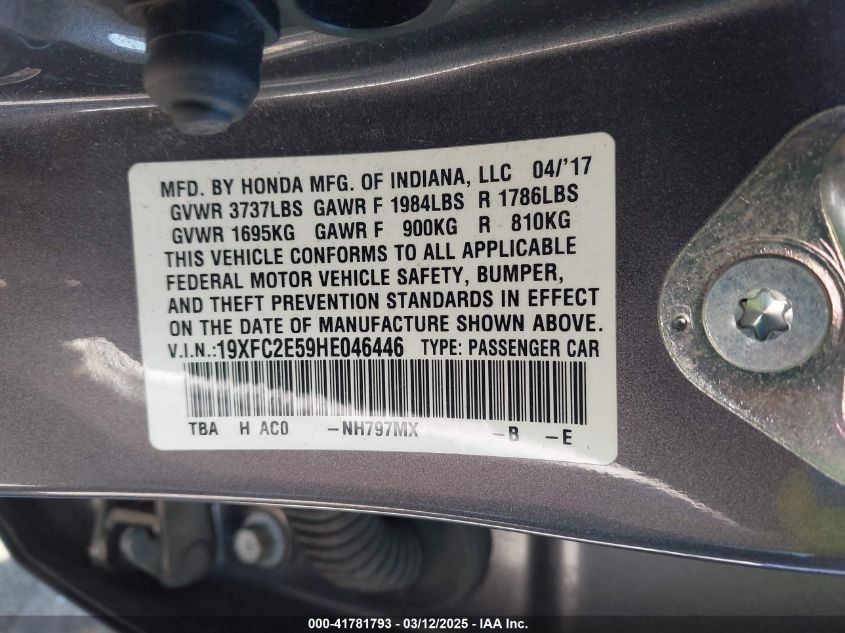2017 HONDA CIVIC 2017 Gasoline, 2.0, Front wheel drive, VIN - 19XFC2E59HE****** from the USA