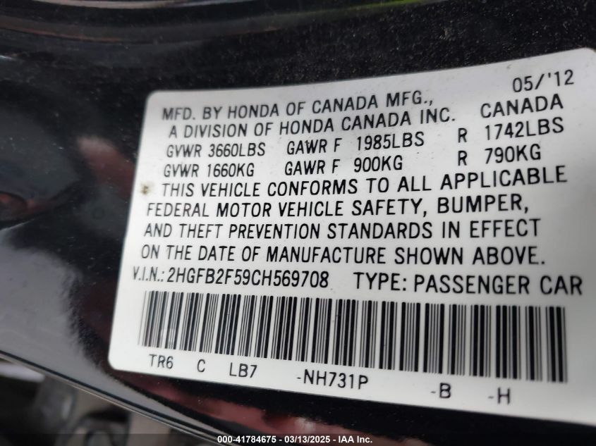 2012 HONDA CIVIC 2012 Gasoline, 1.8, Front wheel drive, VIN - 2HGFB2F59CH****** from the USA